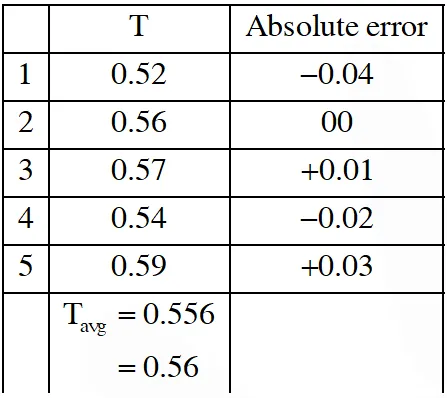 Q. In an experiment to determine the acceleration due to gravity g, the formula used for the time period of a periodic motion is $\mathrm{T}=2 \pi \sqrt{\frac{7(\mathrm{R}-\mathrm{r})}{5 \mathrm{g}}}$. The values of R and r are measured to be $(60 \pm 1) \operatorname{mm}$ and $(10 \pm 1)$ mm, respectively. In five successive measurements, the time period is found to be0.52 s, 0.56 s, 0.57s, 0.54 s and 0.59 s. The least count of the watch used for the measurement of time period is 0.01 s. Which of the following statement(s) is(are) true ?