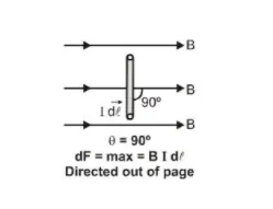 Force on a current element in a magnetic field is maximum $(=\text { BI } \mathrm{d} \ell)$