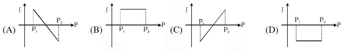 Q. A block of mass m is on an inclined plane of angle $\theta$. The coefficient of friction between the block and the plane is $\mu$ m and tan$\theta$ >m. The block is held stationary by applying a force P parallel to the plane. The direction of force pointing up the plane is taken to be positive. As P is varied from $P_{1}$ = mg (sin$\theta$ – $\mu \mathrm{cos} \theta$) to $P_{2}$=mg$(\sin \theta+\mu \cos \theta)$, the frictional force f versus P graph will look like