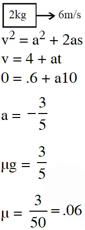 Q. A marble block of mass 2 kg lying on ice when given a velocity of 6 m/s is stopped by friction in 10s. Then the coefficient of friction is-