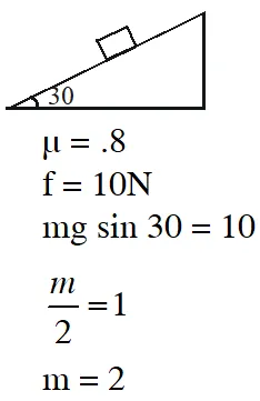 Q. A block rests on a rough inclined plane making an angle of $30^{\circ}$ with the horizontal. The coefficient of static friction between the block and the plane is 0.8. If the frictional force on the block is 10 N, the mass of the block (in kg) is : (taken $\left.\mathrm{g}=10 \mathrm{m} / \mathrm{s}^{2}\right)$