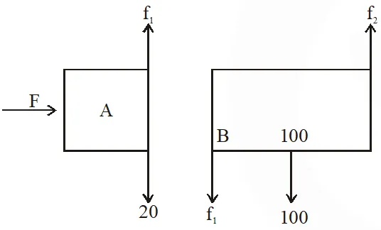 Q. Given in the figure are two blocks A and B of weight 20 N and 100 N, respectively. These are being pressed against a wall by a force F as shown. If the coefficient of friction between the blocks is 0.1 and between block B and the wall is 0.15, the frictional force applied by the wall on block B is :-