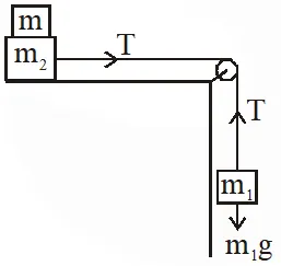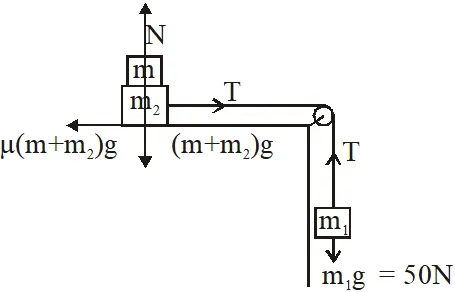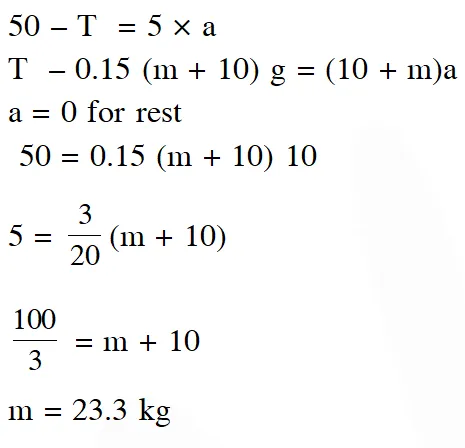 Q. Two masses $\mathrm{m}_{1}$ = 5kg and $\mathrm{m}_{2}$ = 10kg, connected by an inextensible string over a frictionless pulley, are moving as shown in the figure. The coefficient of friction of horizontal surface is 0.15. The minimum weight m that should be put on top of $\mathrm{m}_{2}$ to stop the motion is :-