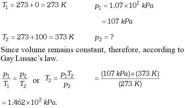 Q. A chamber of constant volume contains hydrogen gas. When the chamber is immersed in a bath of melting ice $\left(0^{\circ} \mathrm{C}\right),$ the pressure of the gas is $1.07 \times 10^{2} \mathrm{kPa} .$ What pressure will be indicated when the chamber is brought to $100^{\circ} \mathrm{C} ?$