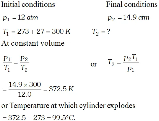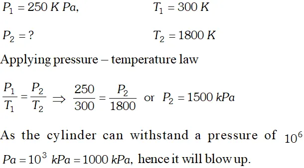 Ans. $\frac{P_{1} V_{1}}{T_{1}}=\frac{P_{2} V_{2}}{T_{2}}$ or $P_{2}=\frac{P_{1} V_{1} T_{2}}{T_{1} V_{2}}$