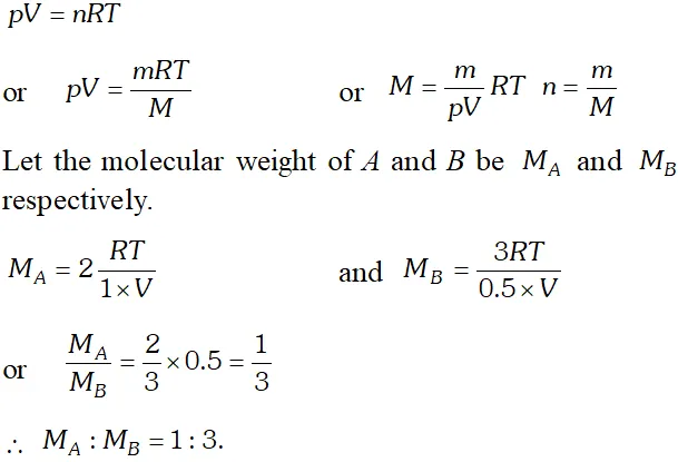 $=\frac{0.25 \mathrm{mol} \times 8.314 \mathrm{JK}^{-1} \mathrm{mol}^{-1} \times 300 \mathrm{K}}{2.5 \times 10^{-3} \mathrm{m}^{3}}$