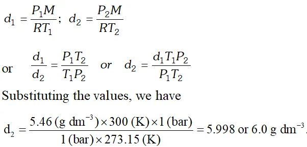 But $d \propto \frac{1}{V} .$ Hence $P_{2}=\frac{P_{1} T_{2}}{T_{1}}\left(\frac{d_{2}}{d_{1}}\right)$