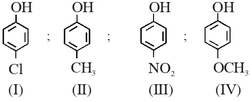 (1) II > IV > I > III (2) I > II > III > IV (3) III > I > II > IV (4) IV > III > I > II [JEE(Main)-2013] Ans. (3) Acidity $\propto-\mathrm{I} /-\mathrm{R} \propto \frac{1}{+\mathrm{I} /+\mathrm{R}}$