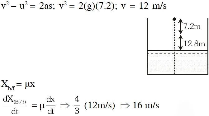 Q. A ball is dropped from a height of 20 m above the surface of water in a lake. The refractive index of water is 4/3. A fish inside the lake, in the line of fall of the ball, is looking at the ball. At an instant, when the ball is 12.8 m above the water surface, the fish sees the speed of ball as $\left[\mathrm{g}=10 \mathrm{m} / \mathrm{s}^{2} .\right]$