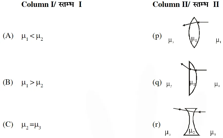 Q. Two transparent media of refractive indices $\mu_{1}$ and $\mu_{3}$ have a solid lens shaped transparent material of refractive index $\mu_{2}$ between them as shown in figures in Column II. A ray traversing these media is also shown in the figures. In Column I different relationships between $\mu_{1}, \mu_{2}$ and $\mu_{3}$ are given. Match them to the ray diagrams shown in Column II.