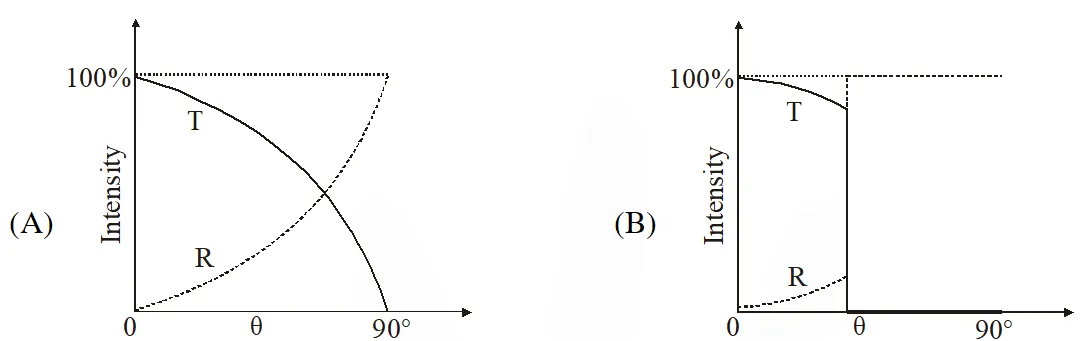 When $\theta=0^{\circ},$ maximum light is transmitted. At $\theta>\theta_{\mathrm{C}}$ (critical angle), no further light is transmitted