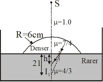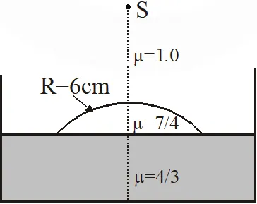 Q. Water (with refractive index = $\frac{4}{3}$) in a tank is 18 cm deep. Oil of refractive index $\frac{7}{4}$ lies on water making a convex surface of radius of curvature ‘R = 6 cm’ as shown. Consider oil to act as a thin lens. An object ‘S’ is placed 24 cm above water surface. The location of its image is at ‘x’ cm above the bottom of the tank. Then ‘x’ is