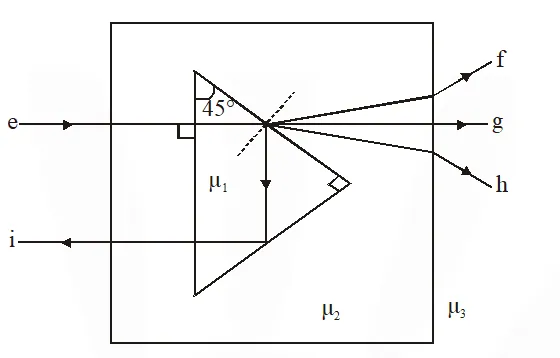Q. A right angled prism of refractive index $\mu_{1}$ is placed in a rectangular block of refractive index $\mu_{2}$, which is surrounded by a medium of refractive index $\mu_{3}$, as shown in the figure. A ray of light 'e' enters the rectangular block at normal incidence. Depending upon the relationships between $\mu_{1}, \mu_{2},$ and $\mu_{3}$, it takes one of the four possible paths 'ef', 'eg', 'eh' or 'ei'.