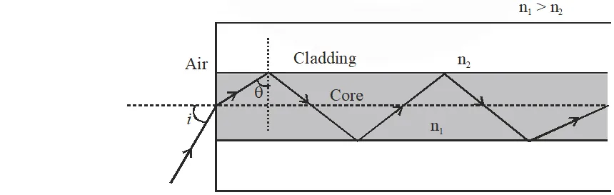 Light guidance in an optical fiber can be understood by considering a structure comprising of thin solid glass cylinder of refractive index $\mathbf{n}_{1}$ surrounded by a medium of lower refractive index $\mathrm{n}_{2}$. The light guidance in the structure takes place due to successive total internal reflections at the interface of the media $\mathbf{n}_{1}$ and $\mathrm{n}_{2}$ as shown in the figure. All rays with the angle of incidence i less than a particular value of $\dot{l}_{\mathrm{m}}$ are confined in the medium of refractive index $\mathrm{n}_{1}$. The numerical aperture (NA) of the structure is defined as sin $i_{\mathrm{m}}$.