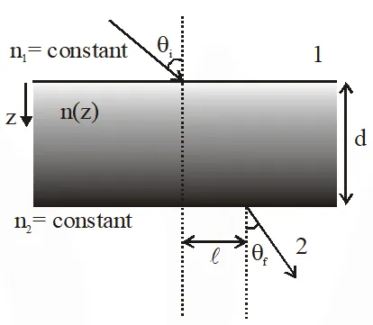 Q. A transparent slab of thickness d has a refractive index n(z) that increases with z. Here z is the vertical distance inside the slab, measured from the top. The slab is placed between two media with uniform refractive indices $\mathrm{n}_{1}$ and $\mathrm{n}_{2}\left(>\mathrm{n}_{1}\right)$, as shown in the figure. A ray of light is incident with angle $\theta_{\mathrm{i}}$ from medium 1 and emerges in medium 2 with refraction angle $\theta_{\mathrm{f}}$ with a lateral displacement . Which of the following statement(s) is(are) true ?