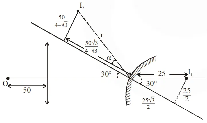 For mirror $\mathrm{V}=\frac{\left(\frac{25 \sqrt{3}}{2}\right)(50)}{\frac{25 \sqrt{3}}{2}-50}=\frac{-50 \sqrt{3}}{4-\sqrt{3}}$