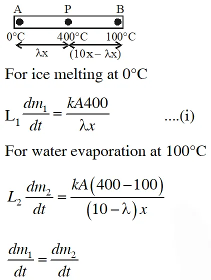 Q. A metal rod AB of length 10x has its one end A in ice at $0^{\circ}$C and the other end B in water at $100^{\circ}$C. If a point P on the rod is maintained at $400^{\circ}$C, then it is found that equal amounts of water and ice evaporate and melt per unit time. The latent heat of evaporation of water is 540 cal/g and latent heat of melting of ice is 80 cal/g. If the point P is at a distance of $\lambda \mathbf{x}$ from the ice end A, find the value of $\lambda$.[ Neglect any heat loss to the surrounding]