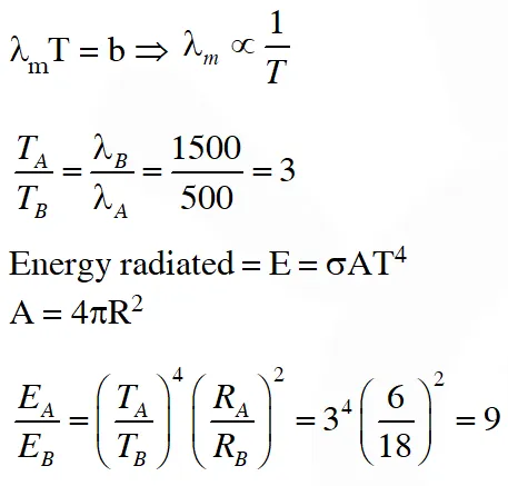 Q. Two spherical bodies A (radius 6 cm) and B (radius 18 cm) are at temperatures $\mathrm{T}_{1}$ and $\mathrm{T}_{2}$, respectively. The maximum intensity in the emission spectrum of A is at 500 nm and in that of B is at 1500 nm. Considering then to be black bodies, what will be the ratio of the rate of total energy radiated by A to that of B ?