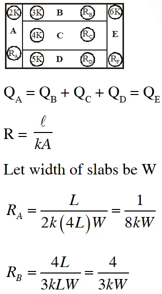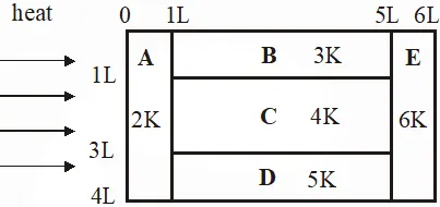 Q. A composite block is made of slabs A, B, C, D and E of different thermal conductivities (given in terms of a constant K) and sizes (given in terms of length, L) as shown in the figure. All slabs are of same width. Heat ‘Q’ flows only from left to right through the blocks. Then in steady state
