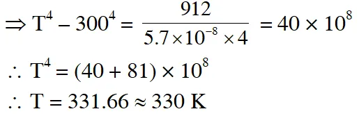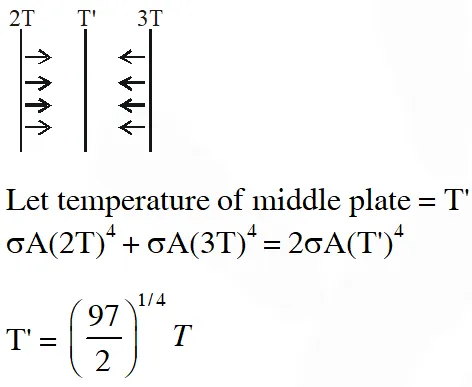 Q. Three very large plates of same area are kept parallel and close to each other. They are considered as ideal black surfaces and have very high thermal conductivity. The first and third plates are maintained at temperatures 2T and 3T respectively. The temperature of the middle (i.e. second) plate under steady state condition is
