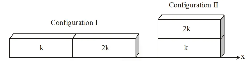 Q. Two rectangular blocks, having identical dimensions, can be arranged either in configuration I or in configuration II as shown in the figure. One of the blocks has thermal conductivity k and the other 2k. The temperature difference between the ends along the x-axis is the same in both the configurations. It takes 9s to transport a certain amount of heat from the hot end to the cold end in the configuration I. The time to transport the same amount of heat in the configuration II is :-