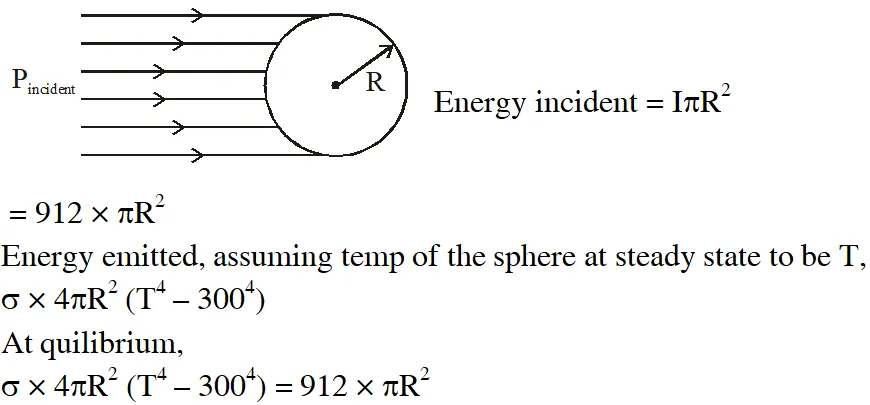 Q. Parallel rays of light of intensity I = 912 $\mathrm{W} \mathrm{m}^{-2}$ are incident on a spherical black body kept in surroundings of temperature 300 K. Take Stefan-Boltzmann constant $\sigma=5.7 \times 10^{-8} \mathrm{Wm}^{-2} \mathrm{K}^{-4}$and assume that the energy exchange with the surroundings is only through radiation. The final steady state temperature of the black body is close to :-