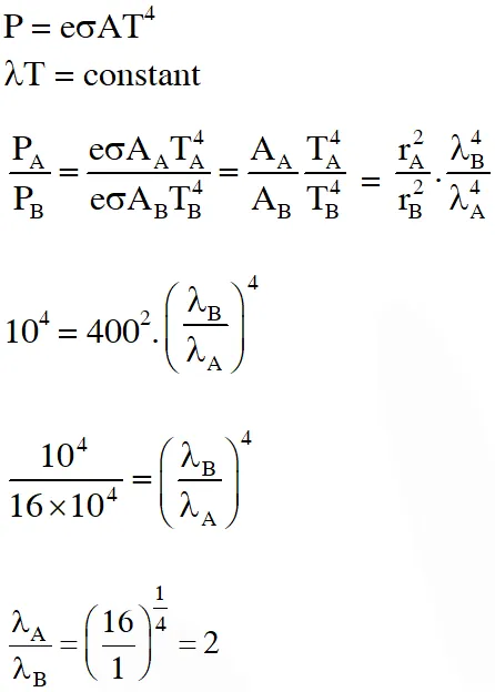 Q. Two spherical stars A and B emit blackbody radiation. The radius of A is 400 times that of B and A emits $10^{4}$ times the power emitted from B. The ratio $\left(\frac{\lambda_{\mathrm{A}}}{\lambda_{\mathrm{B}}}\right)$ of their wavelengths $\lambda_{\mathrm{A}}$ and $\lambda_{\mathrm{B}}$at which the peaks occur in their respective radiation curves is.