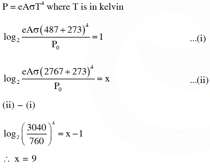 Q. A metal is heated in a furnace where a sensor is kept above the metal surface to read the power radiated (P) by the metal. The sensor has a scale that displays $\log _{2}\left(\mathrm{P} / \mathrm{P}_{0}\right)$, where $P_{0}$ is a constant. When the metal surface is at a temperature of $487^{\circ} \mathrm{C}$, the sensor shows a value 1. Assume that the emissivity of the metallic surface remains constant. What is the value displayed by the sensor when the temperature of the metal surface is raised to $2767^{\circ} \mathrm{C}$ ?