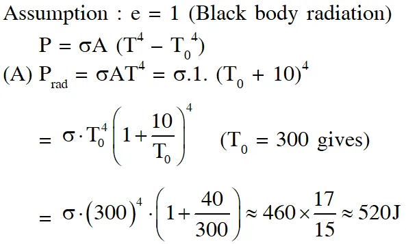 Q. A human body has a surface area of approximately 1 $\mathrm{m}^{2}$. The normal body temperature is 10 K above the surrounding room temperature T0. Take the room temperature to be $\mathrm{T}_{0}=300 \mathrm{K} .$ For $\mathrm{T}_{0}=300 \mathrm{K}$, the value of = $460 \mathrm{Wm}^{-2}$ (where $\sigma$ is the Stefan-Boltzmann constant). Which of the following options is/are correct ?