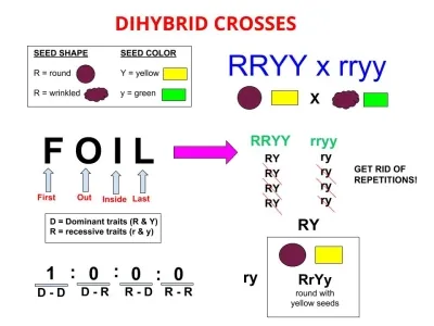 Mendel conducted experiments to observe the inheritance of two pairs of contrasting characters, which is referred to as a dihybrid cross. He performed a cross between pea plants bearing round green seeds and plants bearing wrinkled and yellow seeds. In the F1 generation, he obtained all round and yellow seeds, indicating that the round and yellow traits of seeds are dominant features, while wrinkled and green are recessive. He self-pollinated the plants of the F1 generation to obtain the F2 generation, where he observed four different types of seeds: round yellow, round green, wrinkled yellow, and wrinkled green in the ratio of 9:3:3:1. He concluded that traits are independently inherited.
