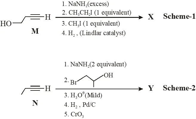 Schemes 1 and 2 describe sequential transformation of alkynes M and N. Consider only the major products formed in each step for both the schemes.