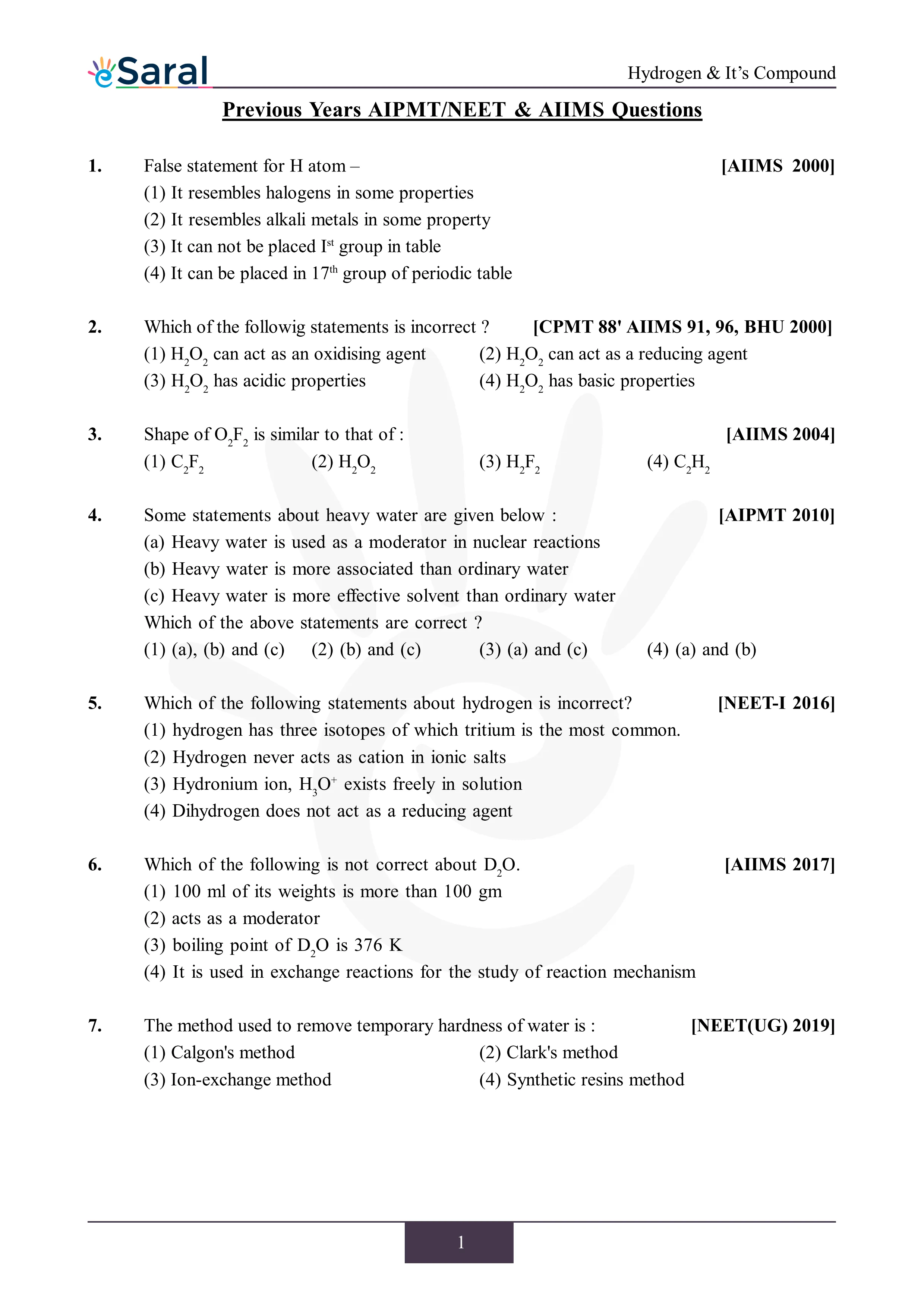 Here you will get Complete Hydrogen & Its Compounds NEET Previous Year Questions with complete and detailed solutions.