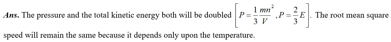 Q. There are n molecules of gas in a box. If the number of molecules is increased to 2n. What will be the effect on the pressure of the gas? On the kinetic energy of the gas? On the root mean square speed of the molecules?