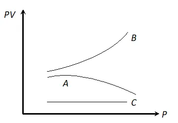 Ans. Gas C is ideal, because PV is constant for this gas. It means the gas C obeys Boyle’s law at all pressures.