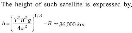 Essential conditions for geo-stationary satellite: (a) A geo-stationary satellite should be at a height of nearly $36,000 \mathrm{km}$ above the equator of earth. (b) The period of revolution around the earth should be the same as that of earth about its axis i.e. exactly 24 hours. (c) It should revolve in an orbit concentric and co- planer with the equatorial plane, so the plane of orbit of the satellite in normal to the axis of rotation of the earth. (d) Its sense of rotation should be same as that of earth about its own axis i.e. from west to east. Its orbital velocity is nearly 3.1 $k m /$ sec. Uses : Geo-stationary satellites are used for purposes of communications as they act as reflectors of suitable waves carrying the messages. Hence they are also called telecommunication satellites. India's INSAT- $2 \mathrm{B}, 2 \mathrm{C}$ are communication satellites. Polar satellites : Such satellite which revolves in polar orbit around the earth is called polar satellites. A polar orbit is one whose angle of inclination with equatorial plane of earth is $90^{\circ}$ and a satellite in polar orbit passes over the both north and south geographic poles respectively once in orbit.