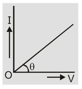 The property of a substance due to which it opposes the flow of current through it is called resistance. It is a scalar quantity with unit volt/ampere called ohm $(\Omega )$ Dimensions of ${\rm{R}} = {{\rm{V}} \over {\rm{I}}} = {{\rm{W}} \over {{\rm{qI}}}} = {{{{\rm{M}}^1}{{\rm{L}}^2}{{\rm{T}}^{ - 2}}} \over {{\rm{ATA}}}} = {{\rm{M}}^\prime }{{\rm{L}}^2}{{\rm{T}}^{ - 3}}{{\rm{A}}^{ - 2}}$ The reciprocal of resistance is called conductance ${\rm{G}} = {1 \over {\rm{R}}}$ The SI unit is ohm-1 or mho or siemen (s) and its dimensions are ${M^{ - 1}}{L^{ - 2}}{{\rm{T}}^3}{{\rm{T}}^2}$. Important Points- The substances which obey ohm’s law are called Ohmic or linear conductor. The resistance of such conductors is independent of magnitude and polarity of applied potential difference. Here the graph between I and V is a straight line passing through the origin. The reciprocal of slope of straight line gives resistance ${\rm{R}} = {{\rm{V}} \over {\rm{I}}} = {1 \over {\tan \theta }}$ = constant.