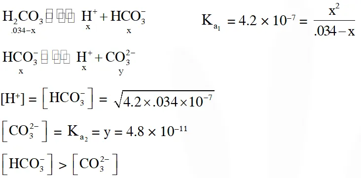 Q. In aqueous solution the ionization constants for carbonic acid are $\mathrm{K}_{1}=4.2 \times 10^{-7}$ and $\mathrm{K}_{2}=4.8$ $\times 10^{-11}$ Select the correct statement for a saturated 0.034 M solution of the carbonic acid :-