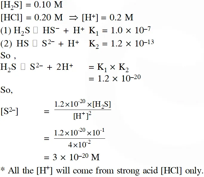 Q. An aqueous solution contains 0.10 M $\mathrm{H}_{2} \mathrm{S}$ and 0.20 M HCl. If the equilibrium constants for the formation of HS– from H2S is 1.0 × $10^{-7}$ and that of $\mathrm{S}^{2-}$ from $\mathrm{HS}^{-}$ ions is 1.2×$10^{-13}$ then the concentration of $\mathrm{S}^{2-}$ ions in aqueous solution is :