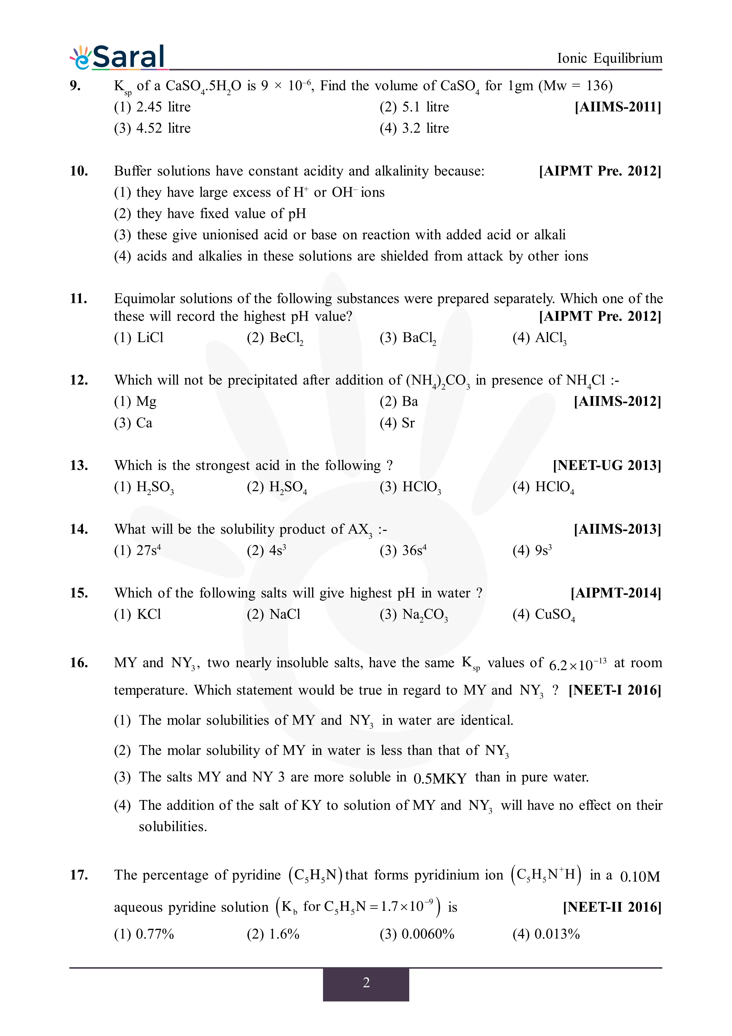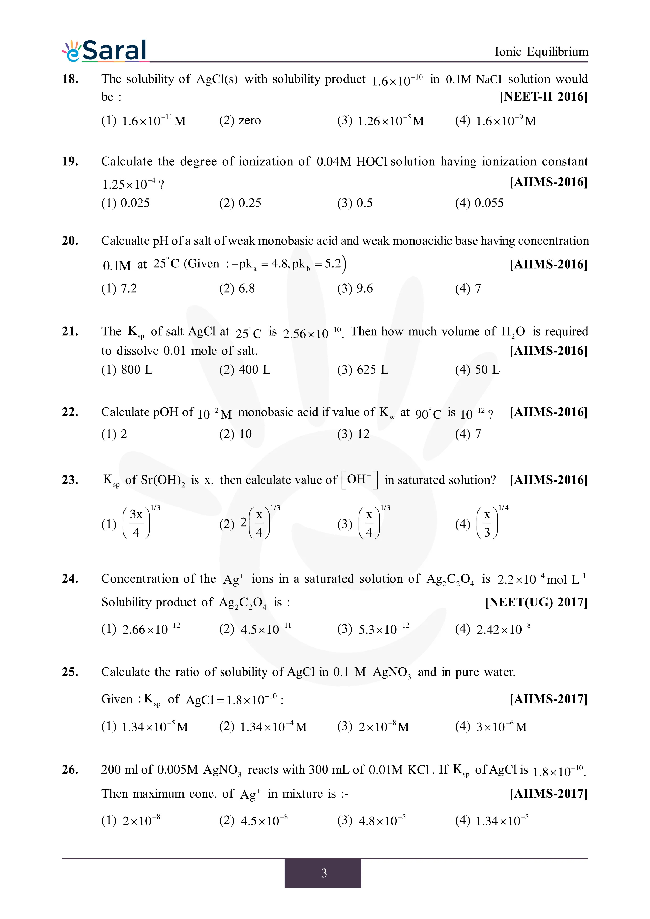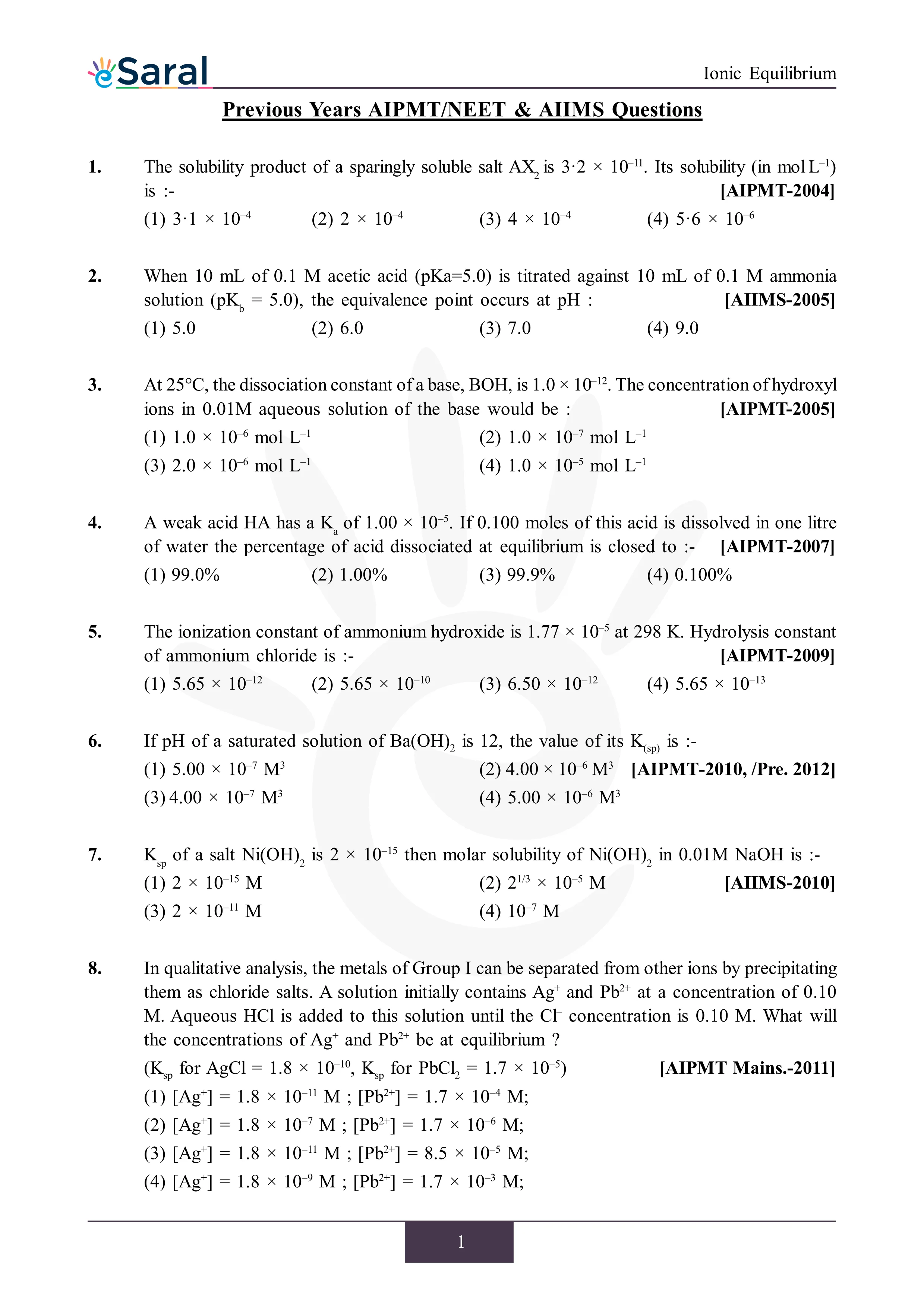 Here you will get Complete Ionic Equilibrium NEET Previous Year Questions with complete and detailed solutions.