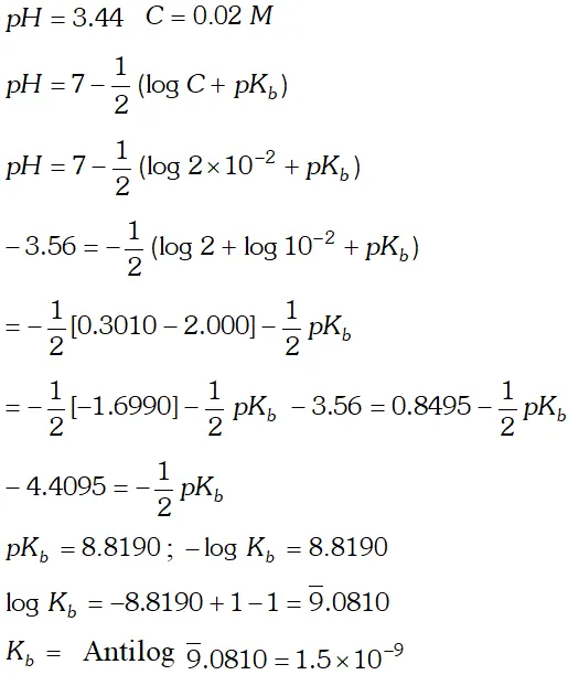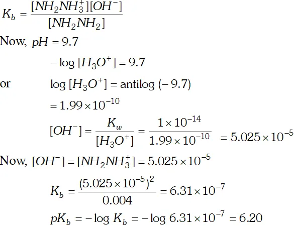 Q. The $p H$ of $0.004 M$ hydrazine solution is $9.7 .$ Calculate its ionization constant $K_{b}$ and $p K_{b}$