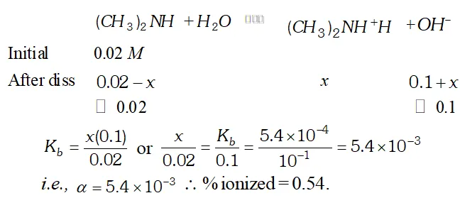 Q. The ionization constant of dimethylamine is $5.4 \times 10^{-4}$ Calculate the degree of ionization in its $0.02 M$ solution. What percentage of dimethylamine is ionized if the solution is also $0.1 M N a O H ?$