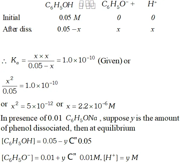 Q. The ionization constant of phenol is $1.0 \times 10^{-10} .$ What is the concentration of phenate ion in $0.05 M$ solution of phenol? What will be its degree of ionization if the solution is also $0.01 M$ sodium phenate?