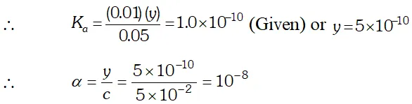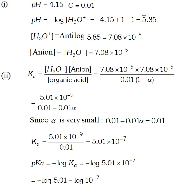 Q. The $p H$ of a $0.01 M$ solution of an organic acid is 4.15 Calculate (i) the concentration of the anion (ii) ionization constant of the acid (iii) $\quad p K_{a}$
