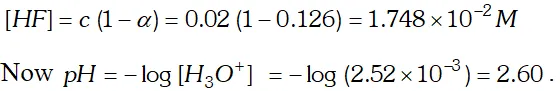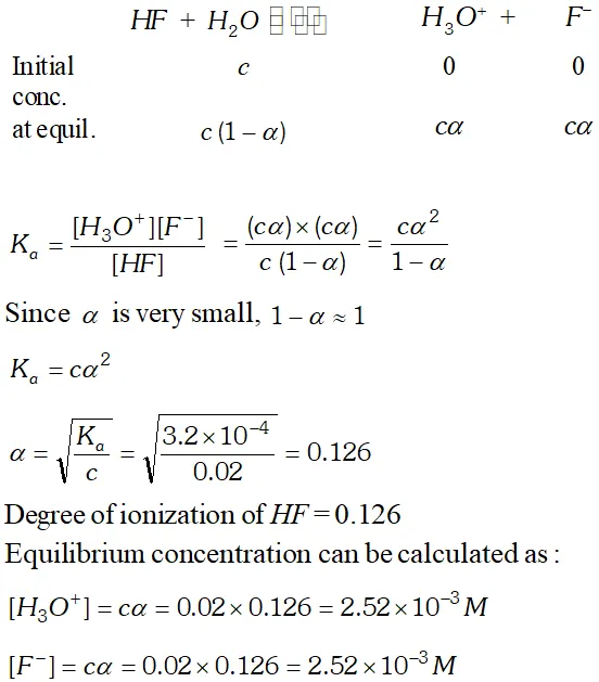 Q. The ionization constant of $H F$ is $3.2 \times 10^{-4} .$ Calculate the degree of dissociation of $H F$ in its $0.02 M$ solution. Calculate the concentration of all species present $\left(H_{3} O^{4}, F^{-} \text {andHH } \text { in the solution and its } p H\right.$