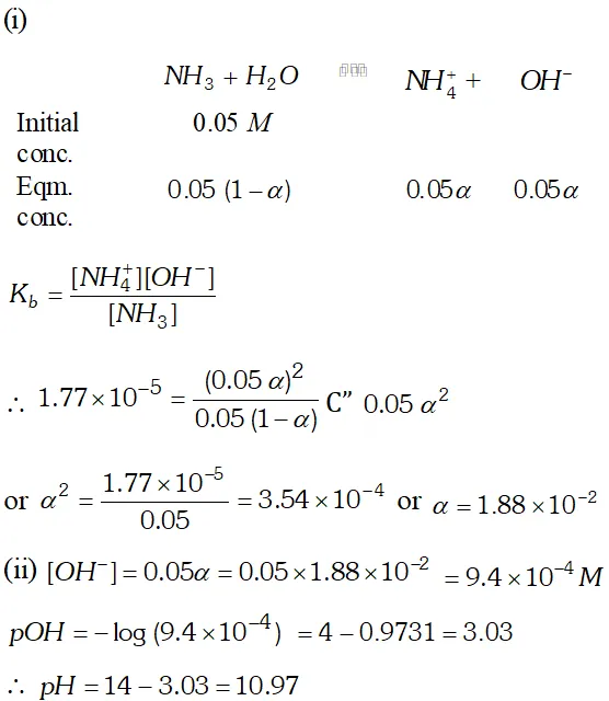 Q. Calculate the degree of ionization and $p H$ of $0.05 M$ ammonia solution. The ionization constant of ammonia $\left(K_{b}\right)$ is $1.77 \times 10^{-5} .$ Also calculate the ionic constant of the conjugate acid of ammonia.