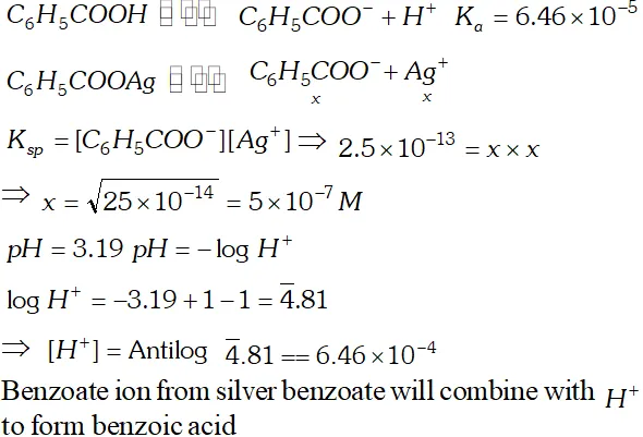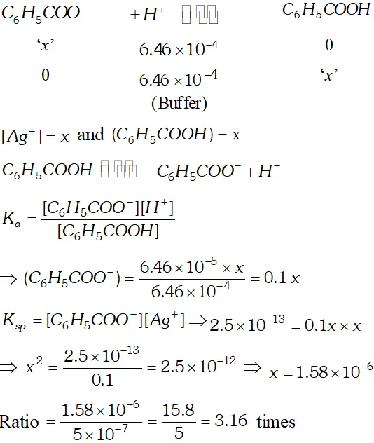 Q. The ionization constant of benzoic acid is $6.46 \times 10^{-5}$ and $K_{s p}$ for silver benzoate is $2.5 \times 10^{-13} .$ How many times is silver benzoate more soluble in a buffer of $p H$ 3.19 compared to its solubility in pure water?