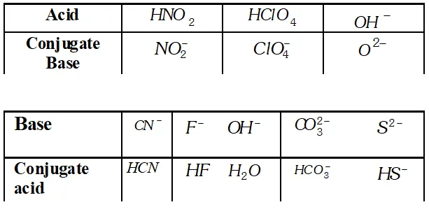 Q. What is meant by the conjugate acid base pair? Find the conjugate acid/base for the following compounds and ions: $H N O_{2}, C N^{-}, H C l O_{4}, F^{-}, O H^{-}, C O_{3}^{2-}$ and $S^{2-}$