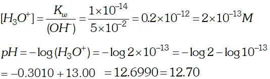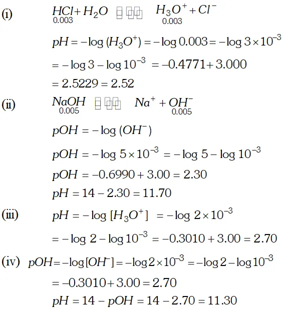 Q. Assuming complete dissociation calculate the $p H$ of the following solution: $0.003 M H C l,(\text { ii }) 0.005 M N a O H,$ (iii) $0.002 M H B r$ (iv) $0.002 M K O H$