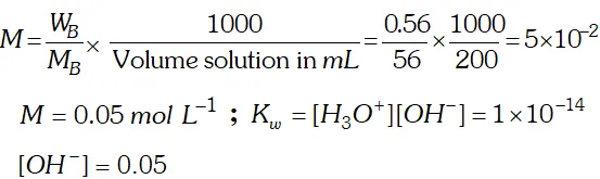 Q. If $0.56 g K O H$ is dissolved in water to give $200 \mathrm{mL}$ of solution at $298 \mathrm{K}$ Calculate the concentration of potassium, hydrogen and hydroxyl ions. What is its $p H ?$