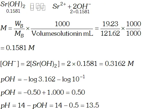 Q. The solubility of $\operatorname{Sr}(\mathrm{OH})_{2}$ at $298 \mathrm{K}$ is $19.23 \mathrm{g} / \mathrm{L}$ of solution. Calculate the concentration of strontium and hydroxyl ions and the $p H$ of the solution.